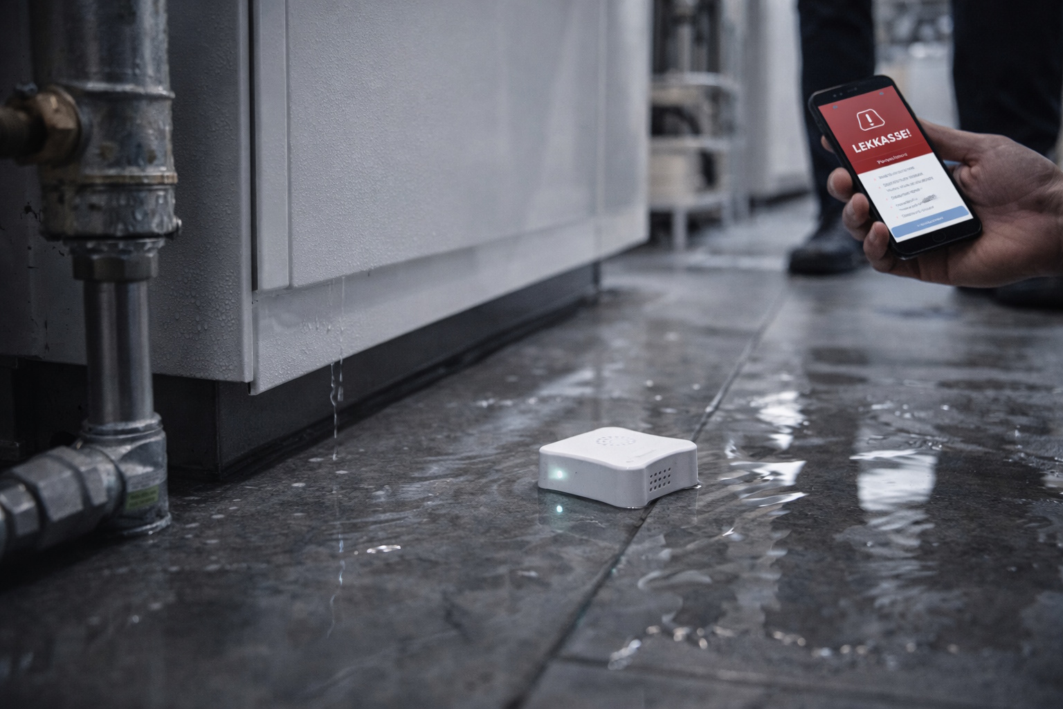 Vannlekkasjer kan føre til omfattende skader og store kostnader. Med våre IoT-baserte lekkasjesensorer får du varsling i det øyeblikket vann oppdages.